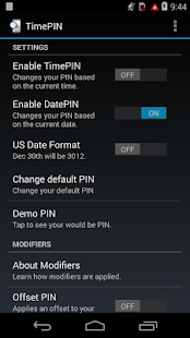 TimePIN is a security and ease of use enhancing application. TimePIN sets your lockscreen PIN code to the current time or date resulting in an ever changing PIN that can not be shoulder surfed or repeated due to fingerprints on the screen. Modifiers allow you to morph the PIN, to further enhance security.