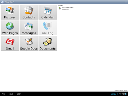 Also you will be able to print photos and images (JPG, PNG, GIF), print emails from Gmail (including attachments: PDF, DOC, XSL, PPT, TXT), print contacts, agenda, sms/mms, call log, web pages (HTML) and other digital content from device internal memory, SD card or cloud source such as Google Drive / Google Docs.