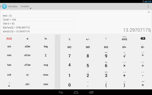 One Calculator is a fully featured scientific calculator with a simple and clean interface, perfectly integrated with Android Holo style.